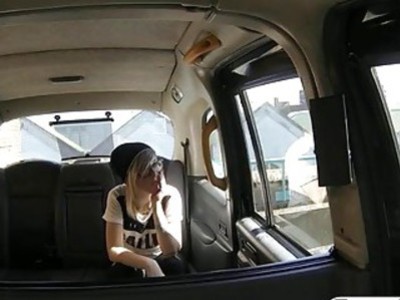 Pirang dengan kacamata kacau oleh sopir palsu di taksi